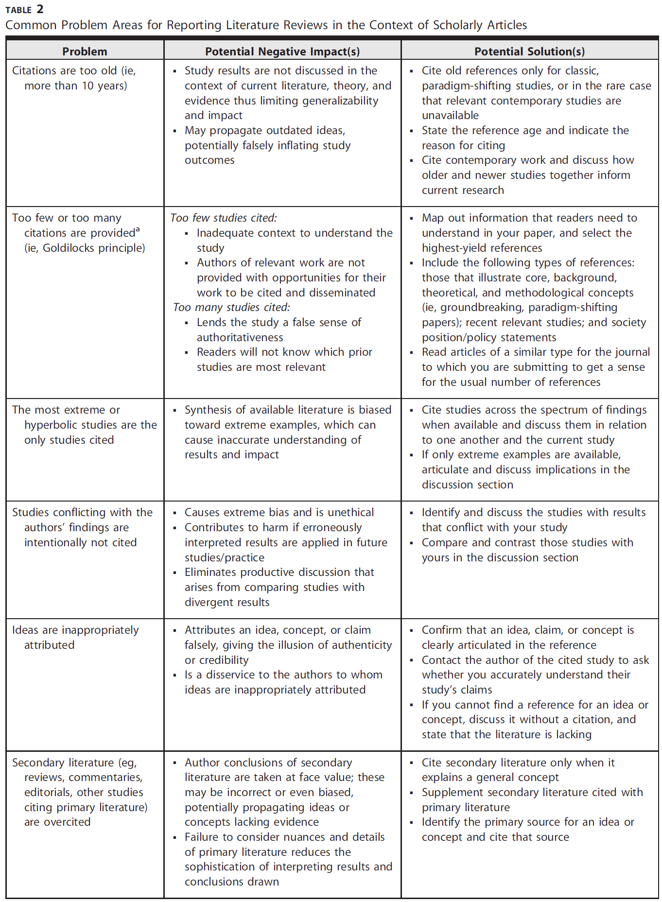 문헌 검토를 계획하려면 저널에 따라 크게 달라지는 저널 요건을 이해해야 합니다(표 1). 저자들은 문헌 검토의 결과 보고와 관련된 일반적인 문제점을 주목하는 것이 좋다. 표 2는 우리가 작가, 검토자, 편집자로서 직면했던 가장 일반적인 문제들을 열거합니다.
