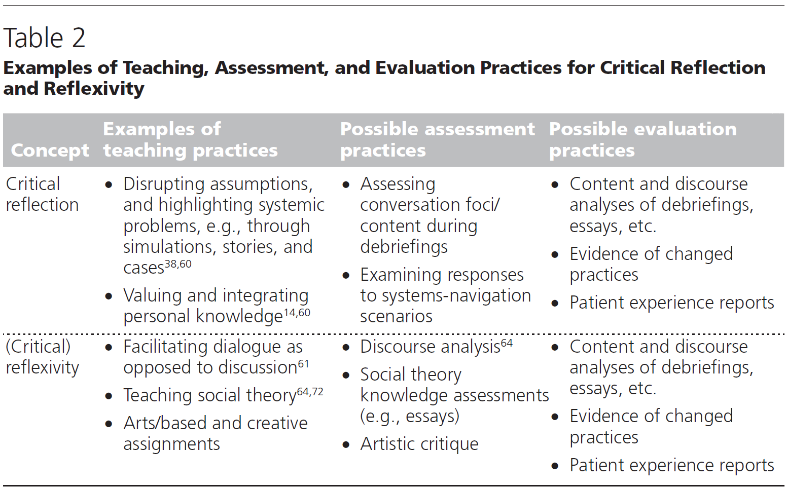 Aligning the academic traditions informing an educational approach with the teaching and assessment methods used is key to the quality and meaning of the educational efforts being employed.59 Critical reflection and critical reflexivity share certain commitments; they both strive for social improvement and challenge existing power structures. We will thus explore not only the differences but also the common challenges and strategies for teaching, assessing, and evaluating critical reflection and reflexivity.