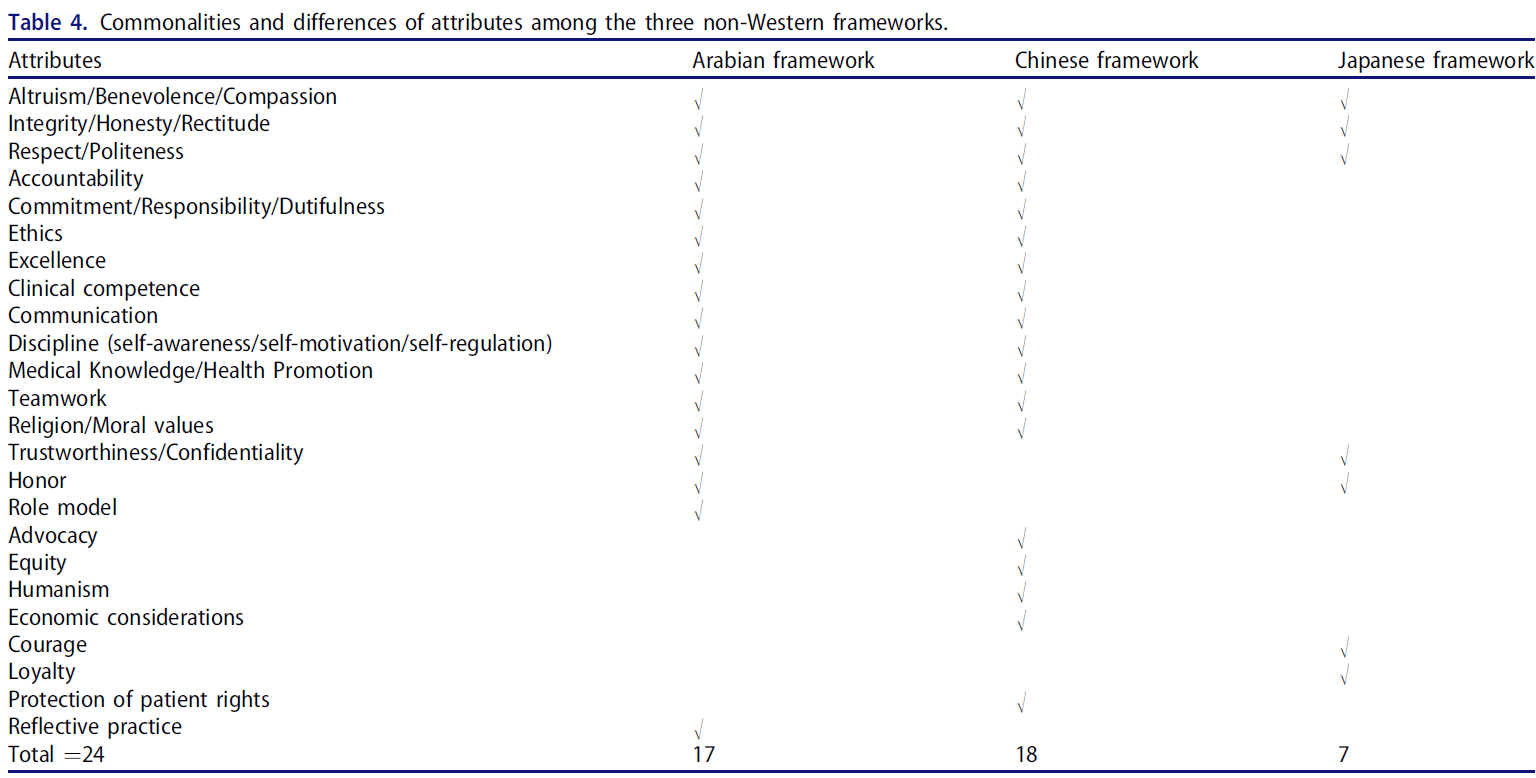 이 세 가지 틀은 아랍 문화에 대한 믿음과 중국과 일본 문화에 대한 전통과 같은 문화적 규범에 의해 주도되고 깊이 영향을 받는다. 3개의 기사에서 총 24개의 속성이 식별되었다(표 4). 많은 개념들이 비서양적 문맥을 다루는 연구들 사이에서 비교될 수 있을 뿐만 아니라, 서양 문화와도 매우 유사했다. 예를 들어 이타주의, 정직과 진실성, 존경, 책임, 팀워크, 윤리, 임상 능력, 헌신과 소통, 환자의 권리와 환자의 보호 등이다.
