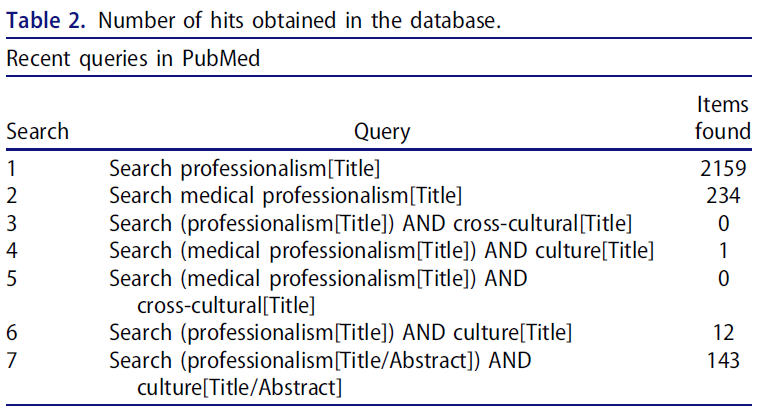 이 검토에는 1947년부터 현재까지 가장 중요한 국제 생물의학 문헌을 다루는 PubMed, Embase(최신 데이터베이스, PsychInFO, Educational Resources Information Center(ERIC; 교육 정보 센터), 사회학적 추상화, TIMELIT(Topics in Medical Education) 등 여러 방법이 사용되었다. PubMed는 1966년부터 시작되는 문헌을 다루는 우리의 연구와 더 관련이 있다. 2002년부터 2014년까지 PubMed 데이터베이스에 대한 검색을 제한했습니다. 그 해 「Physician Charter」가 확립되었기 때문입니다. 표 1은 검색에 사용된 용어를 보여 줍니다. 선택된 모든 연구의 참조는 이후 손으로 검색되었다. 체계적인 검토, RCT, 보고서 및 저널 기사를 포함한 정량적 및 정성적 연구가 연구의 목적으로 사용되었다. 표 2는 데이터베이스의 히트 수를 나타내고 있습니다. 두 명의 검토자는 총계와 요약본을 스캔하여 선택된 모든 연구의 포함 기준을 평가했다. 기사의 참조 리스트를 스캔 해, 의료 프로페셔널리즘과 같은 중요한 작업을 통합할 수 있는 한층 더 관련 있는 연구를 취득했습니다. 그 후, 동일한 두 검토자가 편견의 위험을 고려하여 전문 기사를 검색하여 검토하였다.