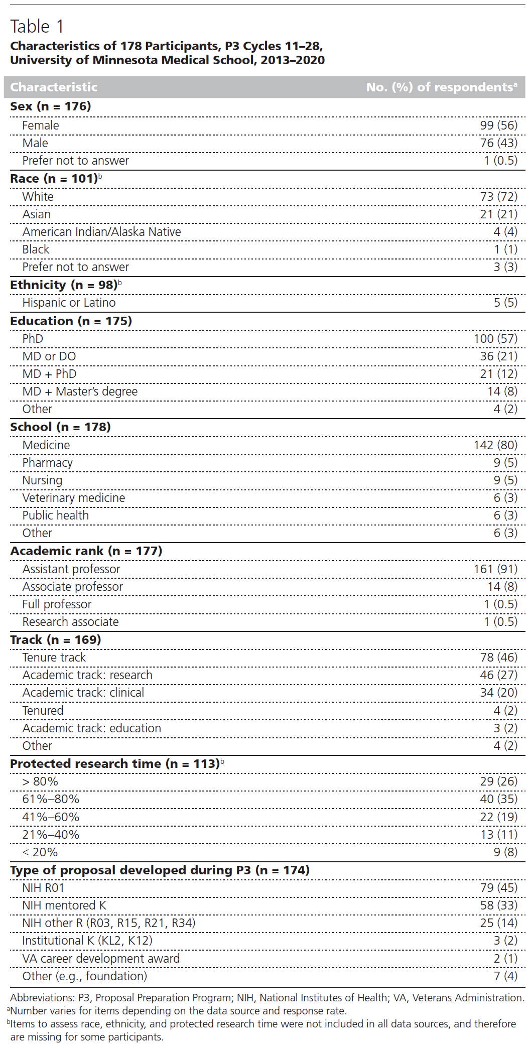 2007년 여름부터 2020년 겨울까지 28개의 P3 사이클이 실시되어 271명의 참가자가 참가했습니다. 인구통계학적 데이터는 처음에는 기록되지 않았다. 그러나 최근 참가자들의 대규모 하위 집합(n = 178, 주기 11-28, 2013년부터 2020년까지 발생)에 대해 이 정보를 수집했다. 데이터는 포스트 프로그램 조사와 프로그램 애플리케이션을 조합하여 작성되었습니다. 이러한 데이터를 통합해, P3 참가자의 가장 포괄적인 그림을 입수할 수 있습니다(표 1). 그림과 같이, 이 참가자 중 여성이 조금 더 많았다. 참가자는 주로 백인 또는 아시아인으로, 백인의 76%, 아시아인의 13%, 흑인 2%, 아메리카 인디언/알래스카 원주민 0.4% 등 폭넓은 교직원의 인종/민족 분열을 대략 반영하고 있습니다. 표 1과 같이, 참가자의 과반수는 의대 교수(프로그램의 창시, 프라이머리 스폰서, 채용의 중점을 반영)이며, 거의 대부분이 조교수였다. 거의 모든 P3 사이클에 중요한 임상 책임을 지는 일부 교직원이 포함되었지만, 대다수는 상당한 연구 보호 시간과 함께 연구 집약적인 위치에 있었다. P3 참여 기간 동안 개발된 가장 일반적인 제안 유형은 NIH R01 제안이었으며, 멘토링된 K 제안 및 기타 R-Series 적용 사례가 그 뒤를 이었다.