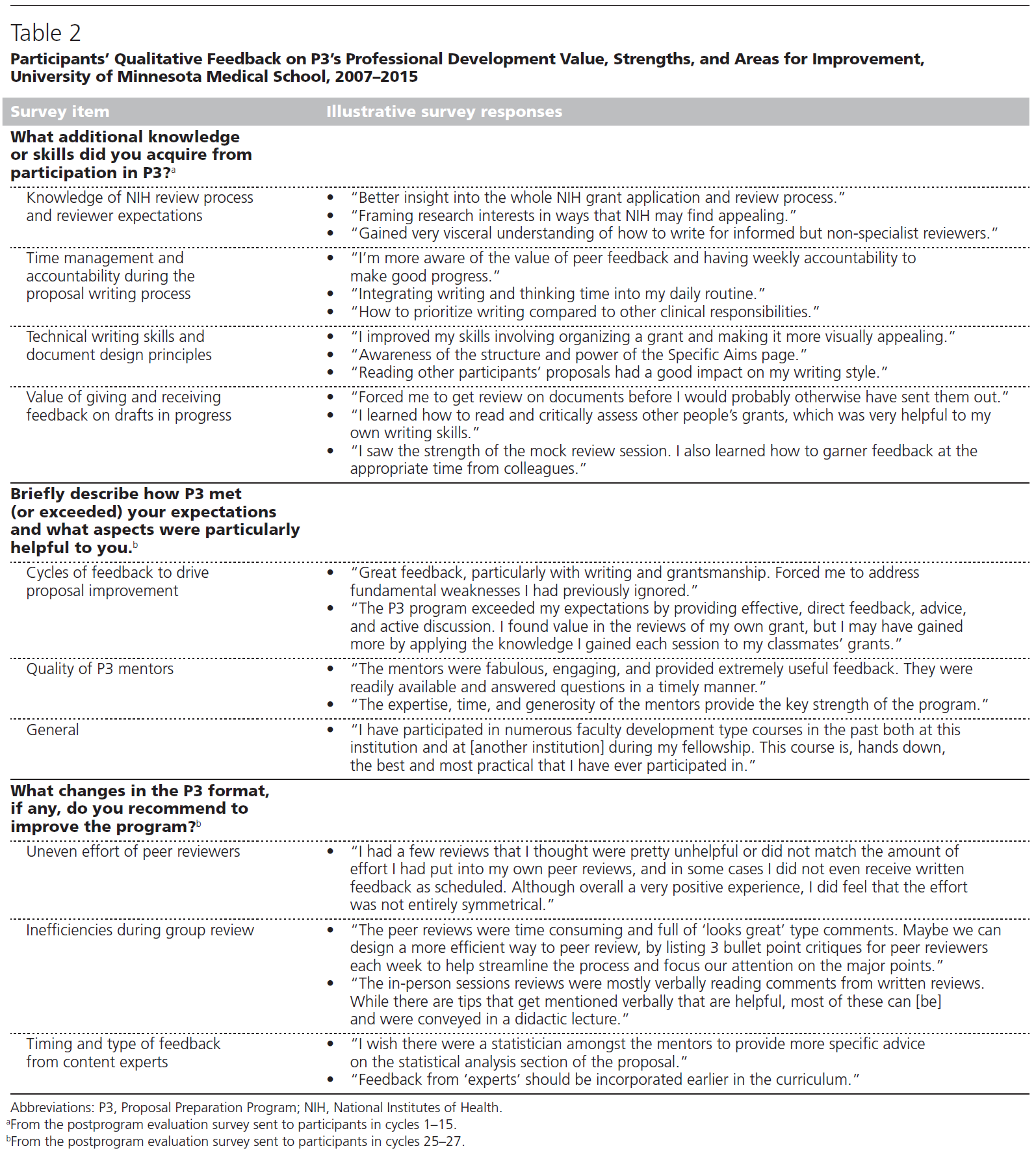 이 조사는 또한 참가자들에게 프로그램의 장점과 단점에 대해 질적 피드백을 요청했다(표 2는 예시적인 답변을 제공한다). 확인된 강점으로는 적극적인 제안서 작성 중에 받은 실질적이고 시기적절한 피드백과, P3 멘토가 참가자의 성공을 위해 했던 투자가 포함된다. 건설적인 비판 중에는 일부 리뷰의 퀄리티에 대한 "불공평함"과 면담의 비효율성에 대한 우려가 있었다. 또, 참가자는 컨텐츠 전문가로부터의 이전의 피드백에 대해서도 희망하고 있습니다. 이는 위에서 설명한 바와 같이 사이클의 중간 외부 리뷰를 시작하기 전이었습니다. 이하에 기술한 바와 같이, 이러한 문제에 대처하기 위해서, 프로그램의 몇개의 추가 변경을 시험적으로 실시하고 있습니다.