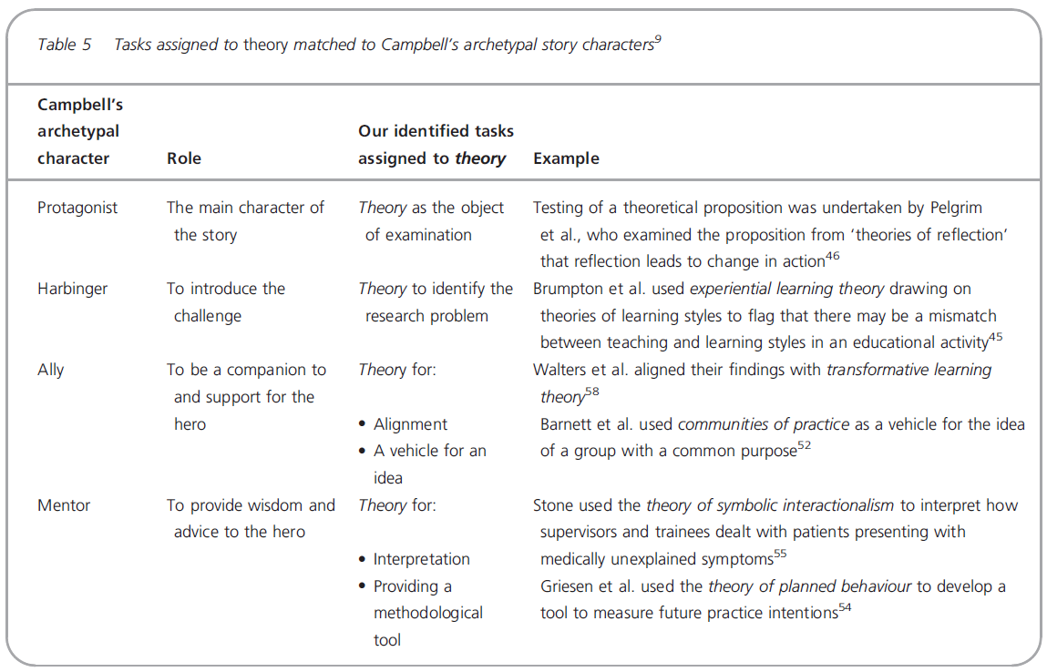 Results: A total of 23 papers were selected. Theories of 'reflective learning', 'communities of practice' and 'adult learning' were most used. Six tasks were assigned to theory: to align with a position; to identify a research problem; to serve as a vehicle for an idea; to provide a methodological tool; to interpret findings, and to represent an object of examination. The prominence of theory in the papers ranged from cameo to major roles. Depending on the way theory was used and the audience, theory had different impacts. There were parallels between the tasks assigned to theory and the roles of four of Campbell's archetypal characters. Campbell's typology offers guidance on how theory can be used in research paper 'stories'.