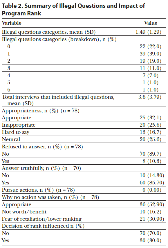 Results: One hundred survey responses were attained for a 33.1% response rate. The majority of respondents were aged 26-30 (76%), women (53%), and white (53%); 33% received 15+ interviews for the application cycle. Seventy-eight percent of respondents reported being asked a prohibited question during at least one interview, with the most common "illegal" question categories being number/ranking of interviews (42%), marital status (33%), career balance (25%), and race/ethnicity (22%). Only 25.6% of applicants considered the subject matter inappropriate, whereas 42.3% were unsure. Although no applicant took action to report the potentially illegal scenarios, 30% said that their experiences influenced their rank list.