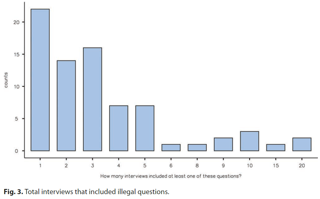 - 본 연구에 따르면 지원자의 33%가 결혼 여부에 관한 질문을 받은 반면, 약 16%는 가족 계획에 관한 질문을 받았다고 답했습니다.