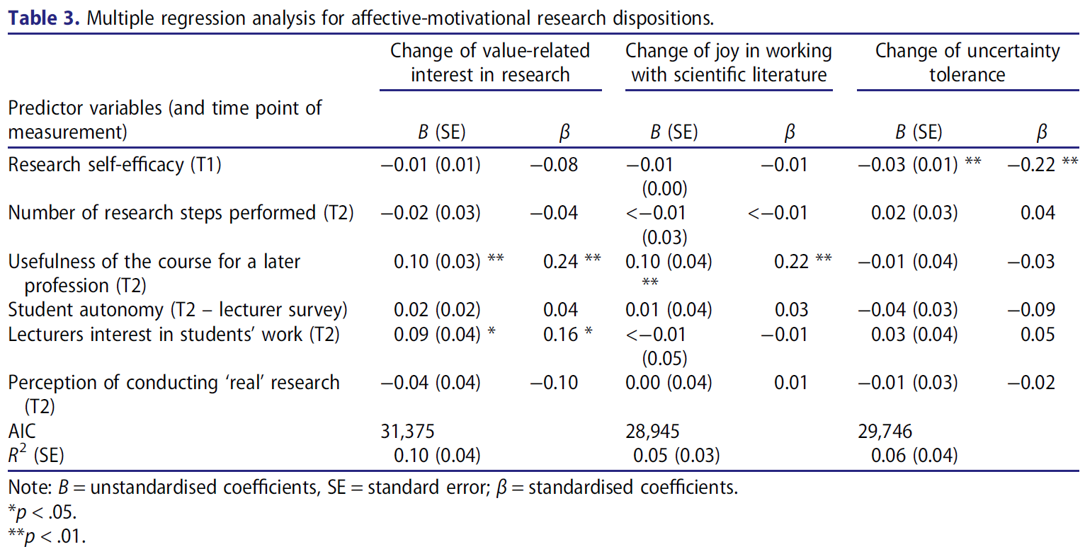 The multiple regression revealed two significant and positive predictors of the latent change in value-related interest in research: the perceived usefulness of the course for one’s later career and the instructor’s perceived interest in the students’ work. The overall variance explained by this regression model was 10% (see Table 3).