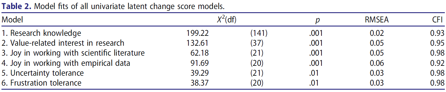 - In the first step, we specified univariate LCMs (with two measurement points, T1 and T2) for each variable. The latent change variable indicates intraindividual changes from T1 to T2. Therefore, this variable was interpreted to test hypotheses H1a and H1b (effectiveness). The variance of the latent change variable indicates interindividual differences, i.e. whether students’ research dispositions develop in different ways.