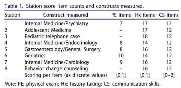 - 6개의 스테이션에서는 환자들이 해결해야 할 다양한 주요 불만 사항을 제시했습니다(5명은 직접 방문, 1명은 전화로). 이 스테이션은 집중적인 병력 청취, 집중적인 신체 진찰, 임상적으로 적절한 감별 진단에 기반한 적절한 관리 계획 수립 및 환자에게 해당 계획을 전달하는 학생의 능력을 평가하도록 설계되었습니다.
