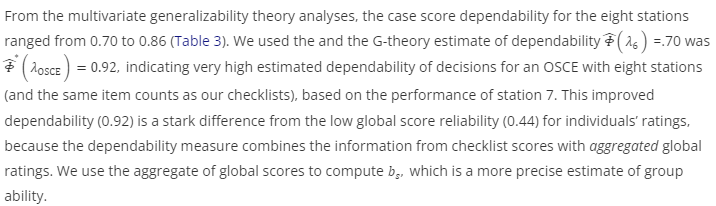 (의도된 목적에 따라) 신뢰할 수 있는 점수는 점수의 타당성을 뒷받침하는 데 필요한(충분하지는 않지만) 증거이며, 이는 지속적인 조사 과정입니다(Kane 2013). 부정확한 점수는 일관된 내용의 표현, 수험자 순위, 합격/불합격 결정, 예측 또는 기타 점수 활용을 뒷받침할 수 없습니다. 이 논문의 핵심 목표는 OSCE 설계 및 채점 결정을 기반으로 점수의 reliability과 dependability의 토대를 구축하는 것이었습니다. 물론 이 측정 방법을 개발하는 과정에서 내용 및 구성 타당도를 확립하기 위한 일반적인 접근 방식도 통합했으며, 이에 대해서는 방법에서 설명합니다.