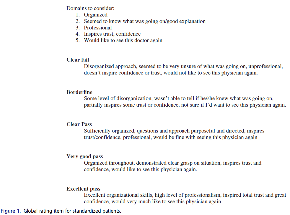 In addition to the above checklists described, there is a single five-point global rating item (Figure 1) that does not count towards the students’ quantitative score but is used solely for standard setting. The authors of the global rating item used in the UK and in much of the literature on borderline regression (Boursicot et al. 2007; Homer and Pell 2009) shared the item with the authors and advised us in the revision of it for use with the SPs based on some work they had done with global rating from SPs. We received input from the SP trainer and a small group of experienced SPs as to what they felt they could make a judgment on from their perspective as an SP. This author identified five key domains in the original global rating item and revised the wording to match the patient perspective.