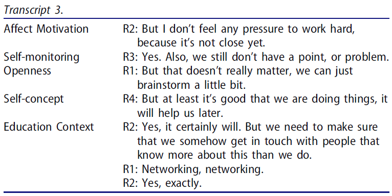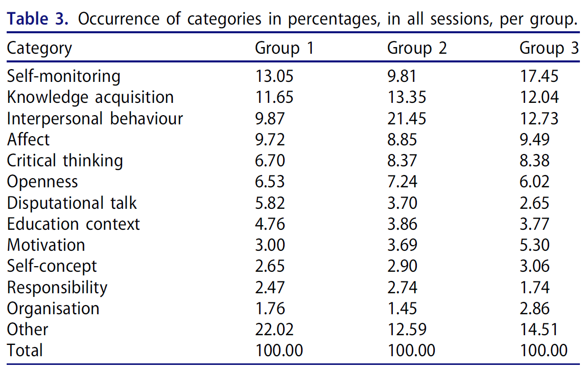 Therefore, the focus of the second research question was on group dynamics, trying to identify patterns of behaviour that could explain why SDL does or does not surface. The results of the present study suggest that a capability to share and discuss emotions (affect) and openness influence SDL positively in terms of self-monitoring and critical thinking, whereas disputational talk sometimes appears to inhibit this process.