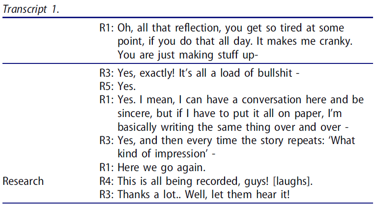 게다가, 많은 녹음물이 소셜 토크나 가십을 포함하고 있기 때문에, 학생들은 자유롭게 대화하는 것처럼 보였는데, 녹음물이나 연구원의 존재에 대해 학생들이 매우 경각심을 가졌다면 아마 일어나지 않았을 것이다. 그들은 종종 연구나 연구자의 상태에 대해 묻곤 했지만, 보통 그들의 대화에 연구자를 끌어들이지 않았다. 성적표 1에서 볼 수 있듯이, 학생들은 서로 녹음에 대해 상기시켰습니다.