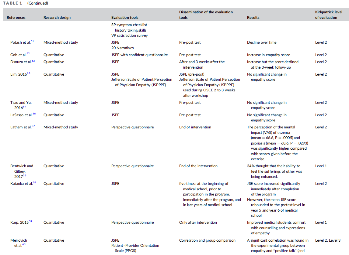 There is also an equal number of studies published in Asia and the United States (10 for each continent). This may indicate that the countries in Asia perceive empathy as an important aspect to be nurtured in medical education specifically during undergraduate years. Quantitative research design still dominates the studies in empathy. As for the outcomes according to Kirkpatrick Evaluation Model, the interventions in postgraduate medical education were evaluated up to Kirkpatrick Level 3 (Behaviour) whereas interventions in undergraduate education were mostly focused on Level 2 (Learning).