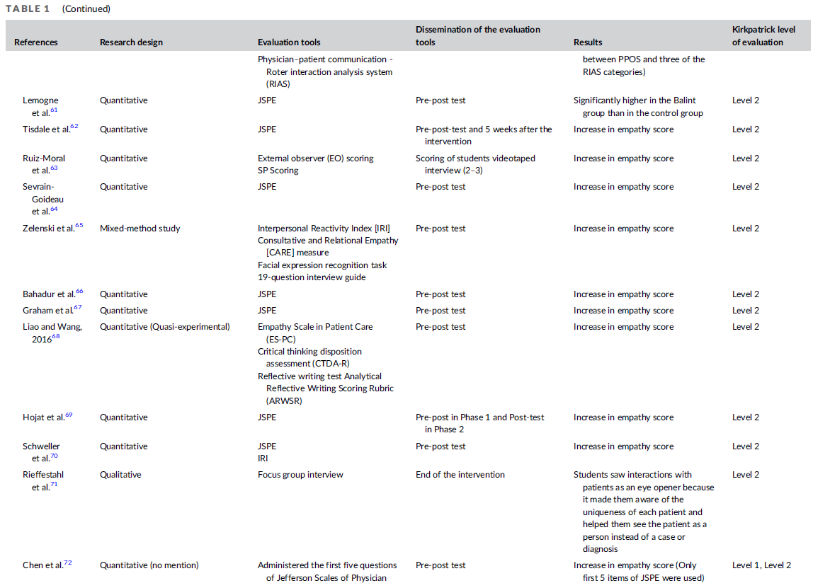 아시아와 미국에서도 같은 수의 연구 결과가 발표된다(각 대륙에 대해 10개). 이것은 [아시아의 국가]들이 특히 학부 시절에 의학교육에서 공감을 길러야 할 중요한 측면으로 인식하고 있음을 나타낼 수 있다. [양적 연구 설계]는 여전히 공감에서 연구를 지배한다. 커크패트릭 평가 모델에 따른 결과에 대해서는 대학원 의학 교육에 대한 개입이 커크패트릭 레벨 3(행동)까지 평가된 반면, 학부 교육에 대한 개입은 대부분 레벨 2(학습)에 초점을 맞췄다.