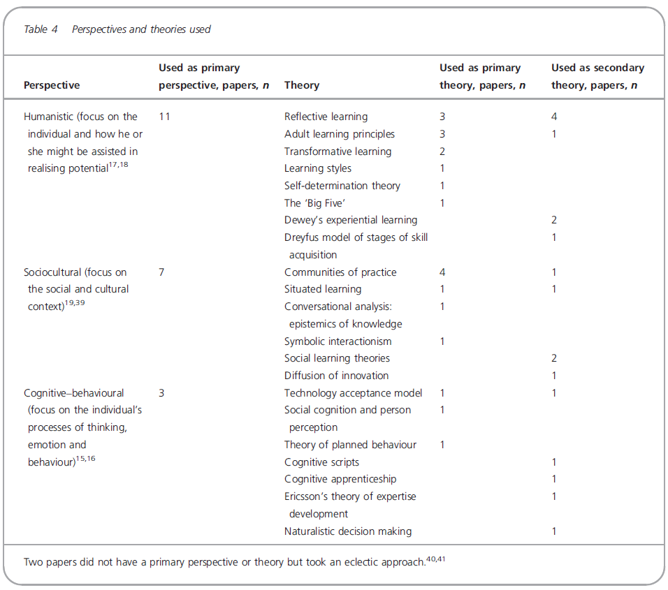 사용된 이론을 확인한 후, 우리는 이것을 의학 교육에서 취해진 세 가지 이론적 관점에 대한 Bleakley 외 연구진의 유형론으로 분류했다.