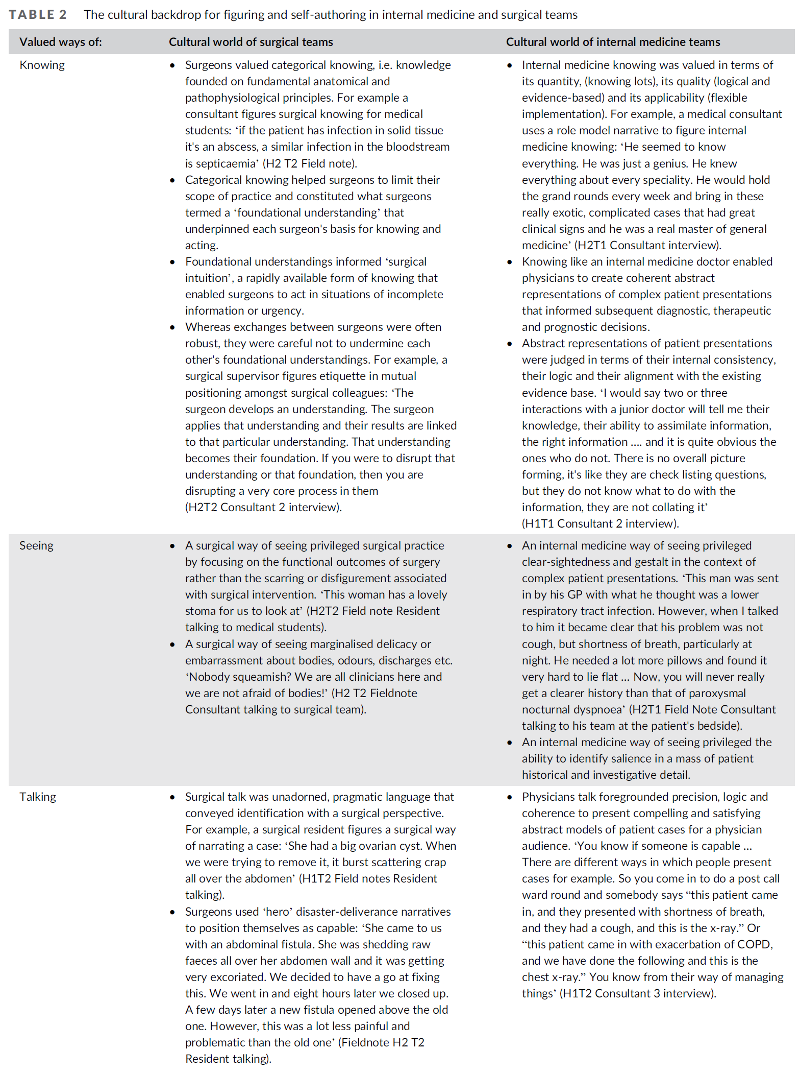 Table 2 illustrates ways of knowing, seeing, talking and being that were particularly valued in the cultural worlds of surgery and IM. Lead clinicians figured and articulated the dispositions and capabilities shown in Table 2, which trainees used to position themselves as capable participants in their respective specialties.