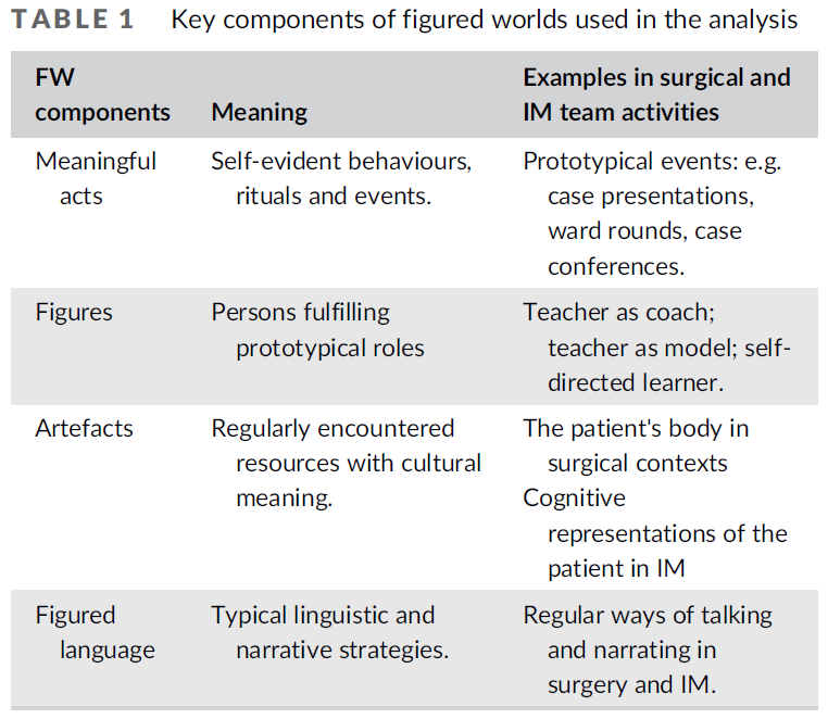 The first phase of analysis, which treated the surgical and IM datasets as two distinct figured worlds, systematically sought key components of Figured Worlds,36, 41 which we list in Table 1. In practice, this meant reading and rereading field notes, interviews and video transcripts to identify meaningful acts, figured types (e.g. teachers in a particular specialty), culturally significant artefacts and other genres listed in Table 1. We regarded interpretive inferences as valid when linguistic evidence, symbols or behaviours present in video or digital images provided empirical support.41 We used this evidence to examine how participants' communicative actions ‘orchestrated’36 their identity positions.