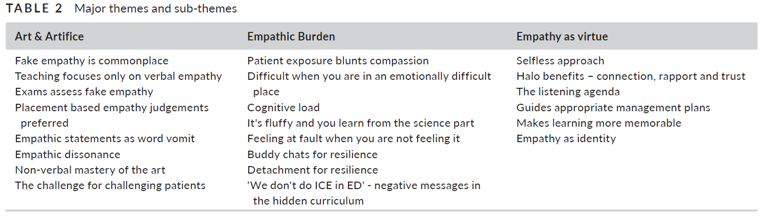 Results: The three major themes were: art and artifice; empathic burden; and empathy as a virtue. Students were uncomfortable with the common practice of faking empathic statements, a problem exacerbated by the need to 'tick the empathy box' during examinations. Students evolved their own empathic style, progressing from rote empathic statements towards phrases which suited their individual communication practice. They also learned non-verbal empathy from positive clinician role-modelling. Students reported considerable empathic burden. Significant barriers to empathy were reported within the hidden curriculum, including negative role-modelling that socialises students into having less compassion for difficult patients. Students strongly associated empathy with virtue.