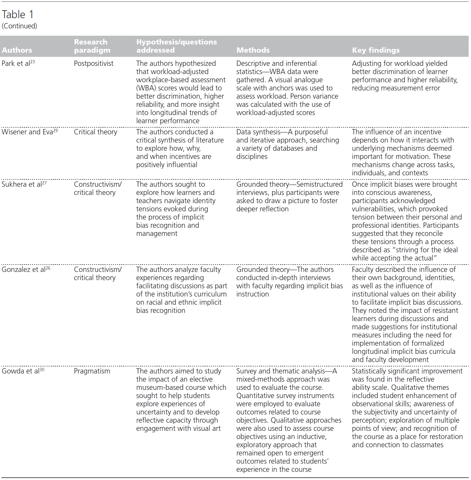 우리는 각 연구팀의 패러다임이 방법론에 어떤 영향을 미쳤는지 탐구함으로써 독자들에게 기사의 일반적인 요약을 제공하는 것을 넘어서는 것을 목표로 한다. "AM 마지막 페이지: 의학교육과 관련된 연구 패러다임에 대한 가이드"를 지침 프레임워크로 사용하여, 우리는 각 수용된 RIME 논문을 검토하여 작가의 연구 패러다임이 어떻게 가시화되고 사용되는 방법인 축성과 관련된 정보에 근거한 선택을 할 수 있는지 고려했다(표 1). 그런 다음 우리는 일상적인 교수 관행인 사전학에서 연구의 영향에 대해 논평한다. 우리는 저자들의 명시적인 진술이 없다면, 아래의 분류는 우리 자신의 해석을 나타내며, 저자나 다른 독자들이 동의하지 않을 수 있다는 것을 인식한다. 우리는 먼저 실증주의/후기실증주의 패러다임을 대표한다고 느끼는 연구 논문을 고려하고, 그 다음으로는 비판이론, 구성주의, 실용주의 패러다임을 가진 논문을 고려한다.