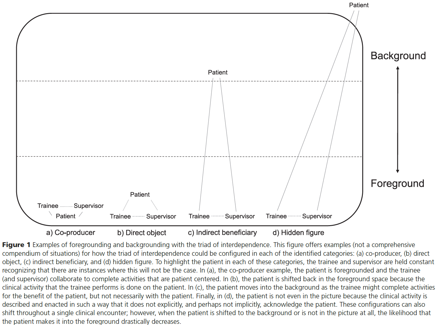 Contemplating the involvement of patients in these EPAs allowed us to consider what is associated with the patient being positioned differently. Figure 1 highlights, using visual illustrations, how each configuration of the triad of interdependence might look in EPAs. If we think about EPAs themselves as triangles and position patients, trainees, and supervisors at the corners of those triangles, you can see various ways the patient can be positioned. The patient can shift from being more in the foreground to more in the background based on changes in how we describe, enact, and assess a clinical activity. Rotation of patients, trainees, and supervisors around a clinical activity also occurs depending on the encounter itself and at various points of time throughout a given encounter. The conceptualization that patients, trainees, and supervisors can have unequal distances allows for a spectrum to exist, which suggests that movement between entities of the triad is also possible.