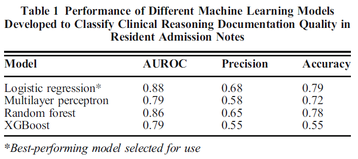 Conclusions: The authors developed and validated a high-performing ML model that classifies CR documentation quality in resident admission notes in the clinical environment-a novel application of ML and NLP with many potential use cases.
