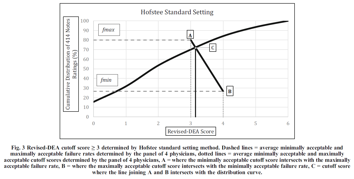 Revised-DEA cutoff for high-quality CR was determined by Hofstee standard setting which utilizes a combination of norm-referenced and criterion-referenced standards where judges decide on the minimum and maximum failure rates and acceptable pass mark to determine the final passing cutoff score.35 Each of the physicians on the panel determined the minimally acceptable and maximally acceptable Revised-DEA cutoff score and failure rate. A Revised-DEA score of ≥ 3 (out of 6) was deemed high quality (Fig. 3). This standard setting process provided validity evidence for the implication inference of Kane’s framework (Fig. 2).