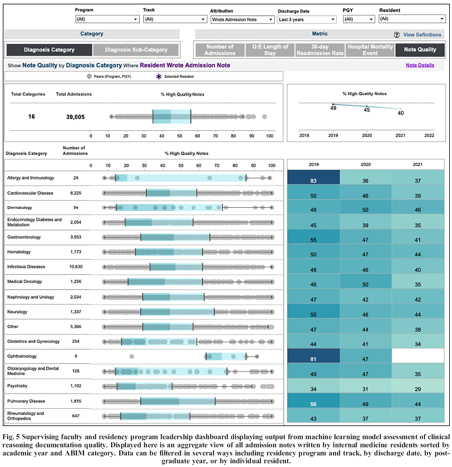 다음 단계는 이 대시보드를 사용하여 CR 문서에 대한 피드백을 제공하도록 교수진을 교육하는 것입니다. 우리는 피드백 세션을 용이하게 하기 위해 개별 및 전체 레지던트 보기가 포함된 대시보드의 교수용 보기화면를 개발했습니다(그림 5). 또한 이 대시보드는 프로그램 리더십이 이 데이터에 액세스할 수 있도록 하여 평가 프로그램에 통합할 수 있습니다. 밀러 피라미드의 '수행' 수준에서 CR에 대한 작업장 기반 평가는 역량 개발에 필수적입니다.41 CR 평가의 과제 중 하나는 상황 특이성(상황의 영향이 CR 프로세스에 미치는 영향) 문제를 고려할 때, 광범위한 사례 샘플링이 필요하다는 것입니다.42 ML 모델을 사용하여 평가에 자동화된 프로세스를 사용하면 다양한 사례에 걸쳐 많은 수의 평가를 신속하게 제공할 수 있으므로 이러한 문제를 극복하는 혁신적인 솔루션이 될 수 있습니다. 마지막으로, 이 ML 모델은 레지던트 개인에게 의미 있는 데이터를 제공하는 것 외에도 커리큘럼 또는 시스템 변경에 대한 정보를 제공하는 데 사용될 수 있습니다. ML 모델은 수동 차트 검토나 기타 평가자 기반 평가(예: 마일스톤)로는 달성할 수 없는 레지던트의 CR 문서화 관행에 대한 대규모 데이터 세트를 즉각적으로 생성할 수 있습니다. 이러한 데이터 세트에서 패턴을 검토하여 부족한 부분을 파악하여 커리큘럼 또는 시스템 변경(예: CR 문서화 커리큘럼 또는 EHR 템플릿 변경)을 알리는 데 도움을 줄 계획이며, 이는 의학교육에서 ML을 혁신적으로 사용하는 것입니다.16