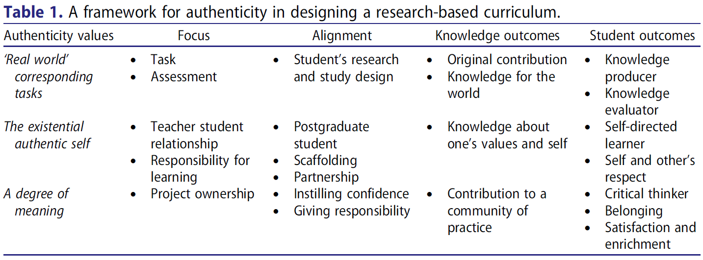 The proposed framework for authenticity presented here, however, offers a more complex understanding of what constitutes authenticity in teaching through research. It does so by adding to the commonly used ‘real world’ corresponding view two other core values of authenticity; namely, the existential authentic self and a degree of meaning. The work of existential philosophers such as Heidegger, Adorno and Sartre, and more specifically their analyses of authenticity in relation to consciousness, responsibility, ownership and care, have been identified and used by scholars in higher education. But our main contribution here is joining these ideas together with the relatively more common ideas about the ‘real world’ within the context of teaching through research. A degree of meaning, which is also closely related to existentialism, reflects the predominantly positive connotation associated with authenticity, which in turn echoes the concept’s more common meanings as a representation of a superior exemplar. Put together, these values constitute a framework that directs teachers towards key focus points and how these align with different outcomes. It allows for some flexibility in designing a curriculum while at the same time provides clearer guidance and boundaries for what we perceive to be authentic in the context of science teaching through research.
