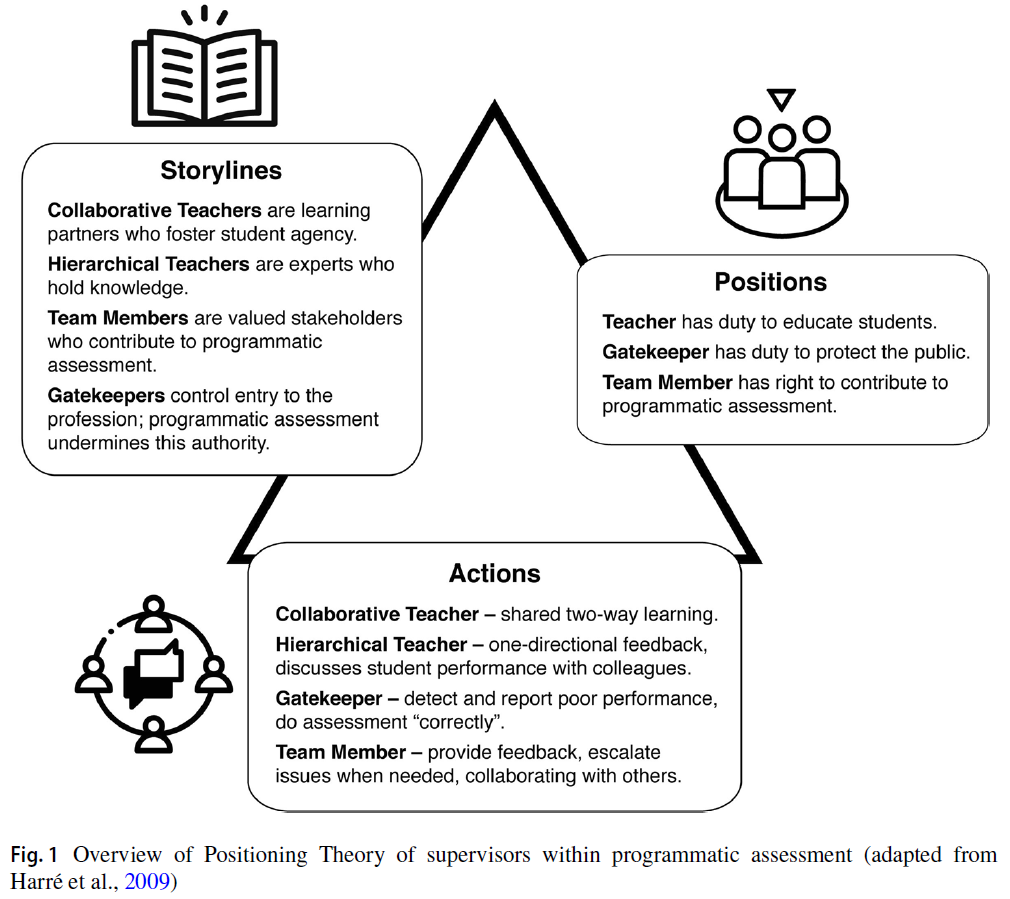 Positioning Theory has been applied to health profession education to explore training initiatives (Møller & Malling, 2019), peer remediation (Bourgeois-Law et al., 2020), practitioner positioning within specific health services (Andreassen & Christensen, 2018; Williams et al., 2015), student identity formation (Monrouxe, 2010), simulation learning (Christensen et al., 2017; Sargeant et al., 2016), feedback (Clarke & Molloy, 2005), and medical educator responsibilities (Hu et al., 2019). To our knowledge, Positioning Theory has not yet been applied to programmatic assessment. When used as an explanatory tool, Positioning Theory allows examination of everyday social episodes for power, influence, institutional, cultural, and social norms, values, and inherent and granted status. This provides insight into why people uniquely respond to social situations which can then be used to understand interventions and address conflict, which in turn can be used to affect positive change (Green et al., 2020). As such, Positioning Theory is a well suited, and novel, lens to explore programmatic assessment as it provides critical insight into the positions and responsibility, and the influence of personal values and cultural practices. Informed by Positioning Theory, we sought to understand how supervisors experienced and perceived their positioning within recently implemented programmatic assessment.