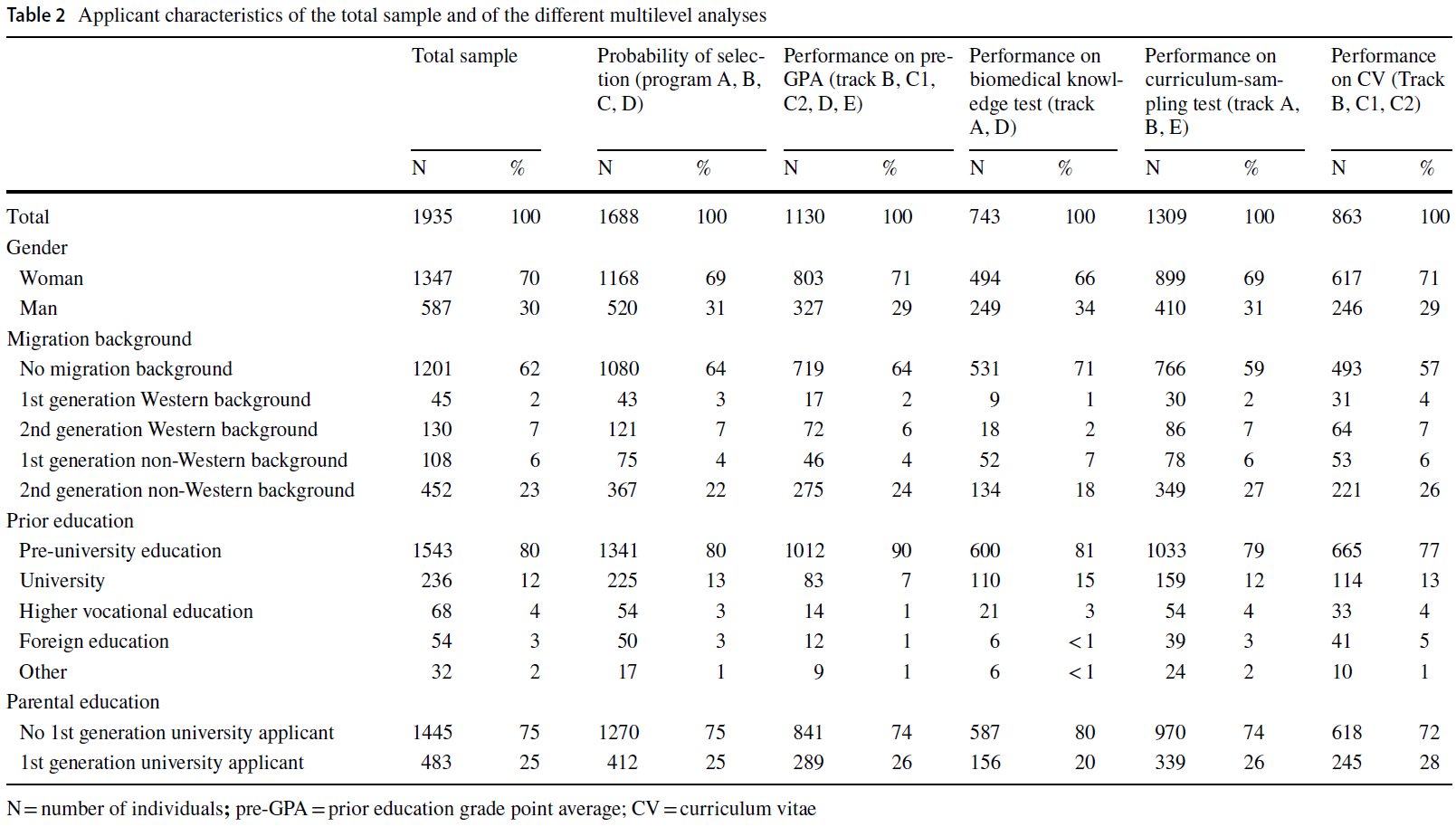 In short, it is not clear how different selection tools can affect student diversity across different contexts. The freedom of Dutch HPE programs to design their selection procedures creates the unique opportunity to compare the effects of selection on student diversity across different procedures with a variety of selection tools. The present prospective multi-site study aimed to evaluate the probability of selection into five undergraduate HPE programs for subgroups of applicants based on gender, migration background (as an indicator of ethnicity), parental education (as an indicator of SES), and prior education. Additionally, we examined performance differences on two traditional selection tools (pre-GPA, biomedical knowledge test), and two tools assessing broadened criteria (curriculum-sampling test, CV).