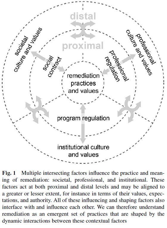 Our first step was to situate remediation within the broader systems of medical education and to clearly define the ways in which remediation differs from other practices and the implications of those differences [3]. In this paper, we have expanded our gaze to consider remediation in societal, professional and institutional contexts.