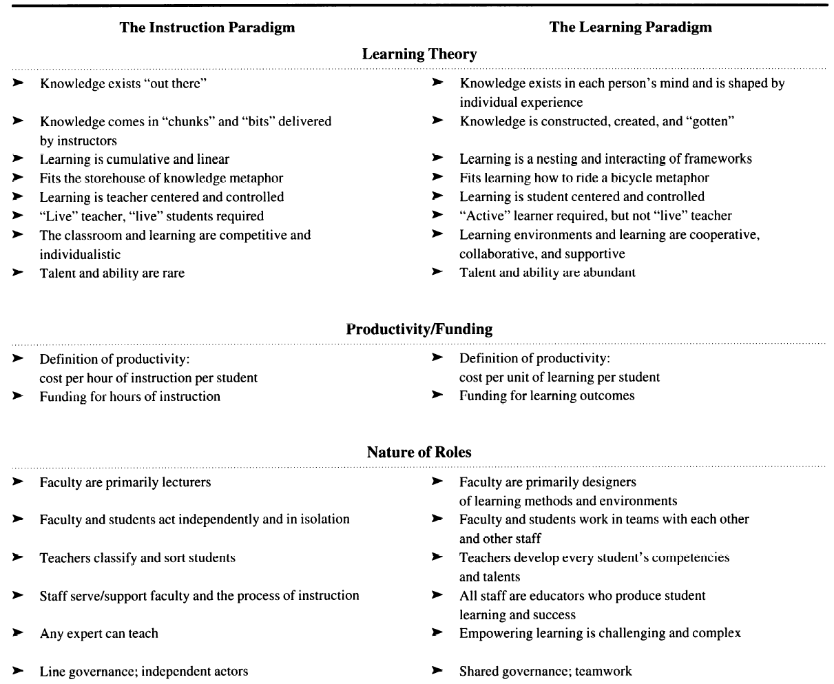 가르침 패러다임에서, 특정한 방법론은 대학이 할 수 있는 일의 경계를 결정한다. 배움 패러다임에서, 학생의 학습과 성공은 경계를 설정한다. 같은 맥락에서, 새로운 패러다임의 모든 요소들이 낡은 요소들의 상응하는 요소들과 반대되는 것은 아니다; 새로운 요소들은 그것의 더 큰 가능성 영역 안에 오래된 요소들의 많은 요소들을 포함한다. 예를 들어, 배움 패러다임은 강의를 금지하지 않습니다. 강의는 적절한 학습을 촉진하는 능력에 기초하여 평가되는 많은 가능한 방법 중 하나가 된다.