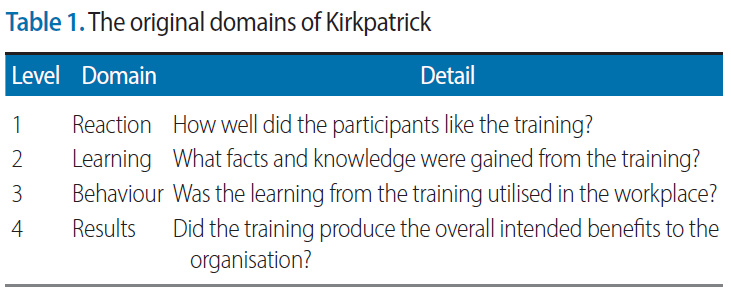 자주 인용되는 학습 평가 모델은 Kirkpatrick[4-6]에 의해 개발되었다. 레벨 간 링크는 원래 개입과 전체 결과 사이의 브리지를 이해하기 위한 수단으로 쿡과 웨스트[7]에 의해 지원되지만 표 1에 기술된 Kirkpatrick 자신은 원래 '레벨'이라는 용어를 사용하지 않았다(그림 1).