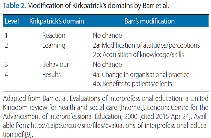 '레벨'이라는 개념의 사용은 Kirkpatrick 프레임워크가 산출물product에(즉 프로세스보다는 관심 있는 특정 학습 결과의 측면에) 관한 것임을 암시하며, 이는 그 결과를 달성하는 데 필요한 지침의 품질일 것이다[8]. 개념적 프레임워크는 종종 원래 모델의 이전 이론과 개정에 기초한다. 커크패트릭 접근법의 가장 일반적으로 인용되는 변형 중 하나는 Barr 외 연구진[9]에 의해 제안되었다. 전문가 간 교육 검토에서 커크패트릭 프레임워크의 레벨 2와 레벨 4의 하위 유형이 추가되었다(표 2).
