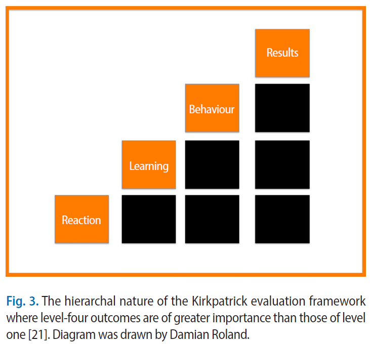 Commentaries on concerns with Kirkpatrick’s design predominantly relate to industries outside of health care. Bates [21] raised three concerns with the Kirkpatrick approach: It is an incomplete model, there is an unproven assumption of causality, and the higher outcome levels do not necessarily imply high er levels of information. Despite Kirkpatrick not initially er levels of information. Despite Kirkpatrick not initially using the term “level” himself, his design implicitly suggests that level-four outcomes are of greater importance than those of level one (Fig. 3).