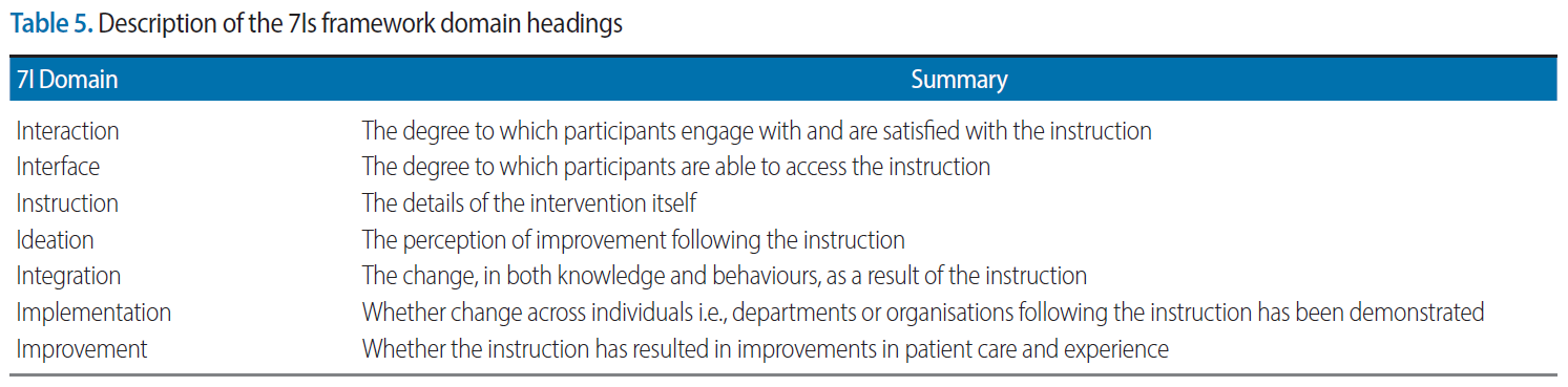이는 계층이 아닌 공통 도메인으로 학습과 행동 섹션을 통합합니다. 의료의 복잡성을 인식하여 Kirkpatrick의 프레임워크의 레벨 4에 해당하는 '결과'의 개념은 '실행'과 '개선'이 된다. 이를 통해 직접적인 임상 효과뿐만 아니라 경험 결과 측정으로도 환자 편익을 캡슐화할 수 있다. 잠정적으로 '7 is framework'라는 제목의 개념적 프레임워크는 그림 4와 표 5에 나타나 있다. 'I'의 반복은 우연이지만 프레임워크의 기억에 도움이 될 수 있다.