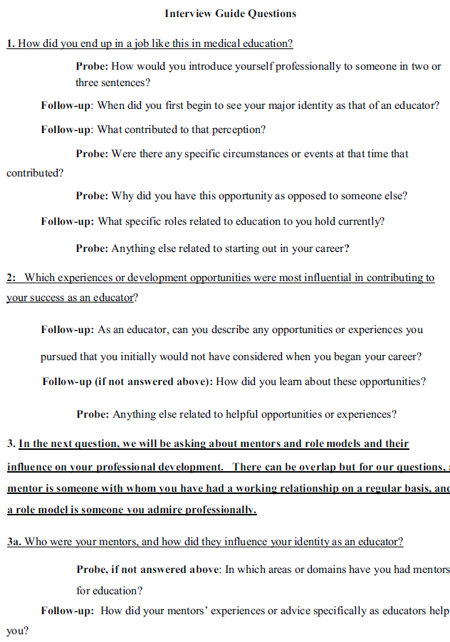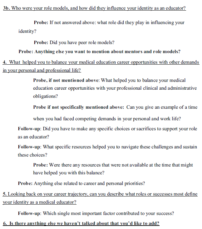연구팀은 SCCT로부터 informed된 인터뷰 가이드를 개발했으며, 각 현장에서 연구 샘플에 포함되지 않은 1–2명의 교수진을 대상으로 시범 실시한 후 가이드를 세분화하여 6개의 주요 질문을 프로브와 함께 작성했다("부록 1" 참조). 면접관은 소급 재검사에서 발생할 수 있는 리콜 편향을 방지하기 위해 참가자의 경험과 관련된 추가 특이성, 상세성, 컨텍스트 및 이벤트를 장려하기 위해 조사를 사용했다.