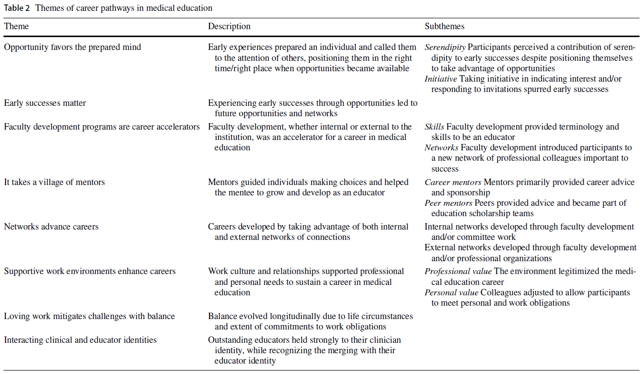 - First, an educator began down the path of education through preparation and proactivity, despite often attributing success to serendipity. These early steps led to an initial opportunity (a leadership role or responsibility) that served as a “launch point” to introduce them to networks, mentors, and opportunities, including faculty development programs.