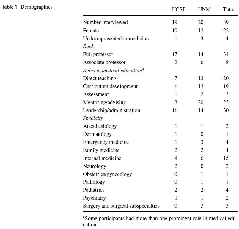 연구 참여자는 직접 교육, 커리큘럼 개발, 평가, 멘토링/자문 및 리더십/관리 분야에서 의료 교육 내에서 중요한 역할 또는 인정을 받은 전임 의사 또는 부교수 수준의 교수였다. 8명으로 구성된 조사팀에는 2개의 현장 기반 팀이 포함되어 있으며, 각 팀에는 2명의 주니어 및 2명의 수석 의료진, 2명의 선임 교수진에는 모두 임상의, 2명의 임상의와 2명의 의사가 준비된 교육자가 포함되어 있다.