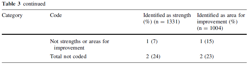- 질적 데이터에서 확인된 5가지 강점은 [관계 설정, 임상 전문 지식, 커뮤니케이션 기술, 열정, 정직이나 재치와 같은 기타 개별 속성]이었다. 전체적으로 참여자의 54%가 대인관계 능력이나 속성을 강점으로, 17%의 자유 텍스트 코멘트가 관계 구축을 핵심 강점으로 구체적으로 지목했다.