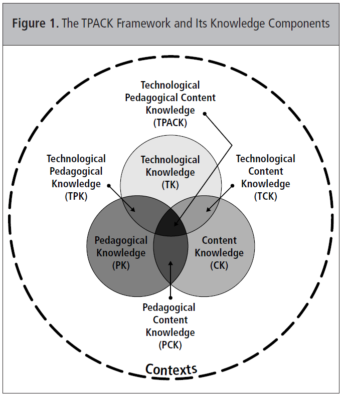 Finally the outer-dotted circle labeled “contexts” emphasizes the realization that technology, pedagogy, and content do not exist in a vacuum, but rather, are instantiated in specific learning and teaching contexts.