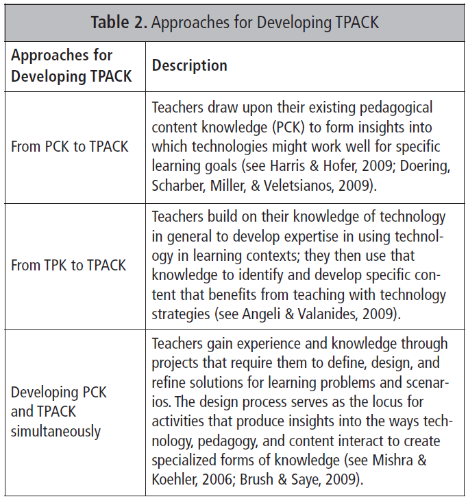 Table 2 presents descriptions of three approaches for developing TPACK, including representative articles for each approach.