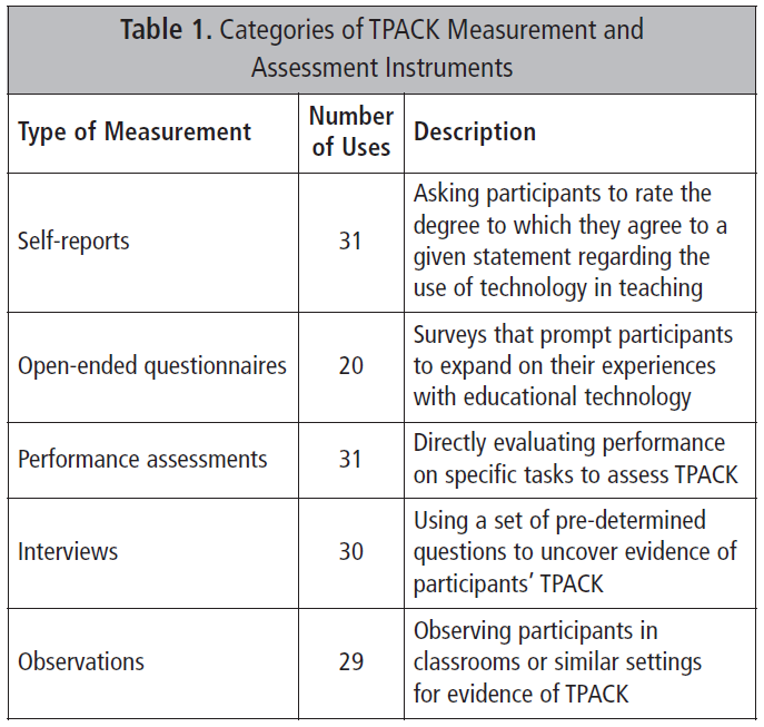 Boogt와 동료들(2013)은 TPACK의 개념을 다룬 2005년과 2011년 사이에 출판된 기사와 책 장에 대한 검토를 실시했다.