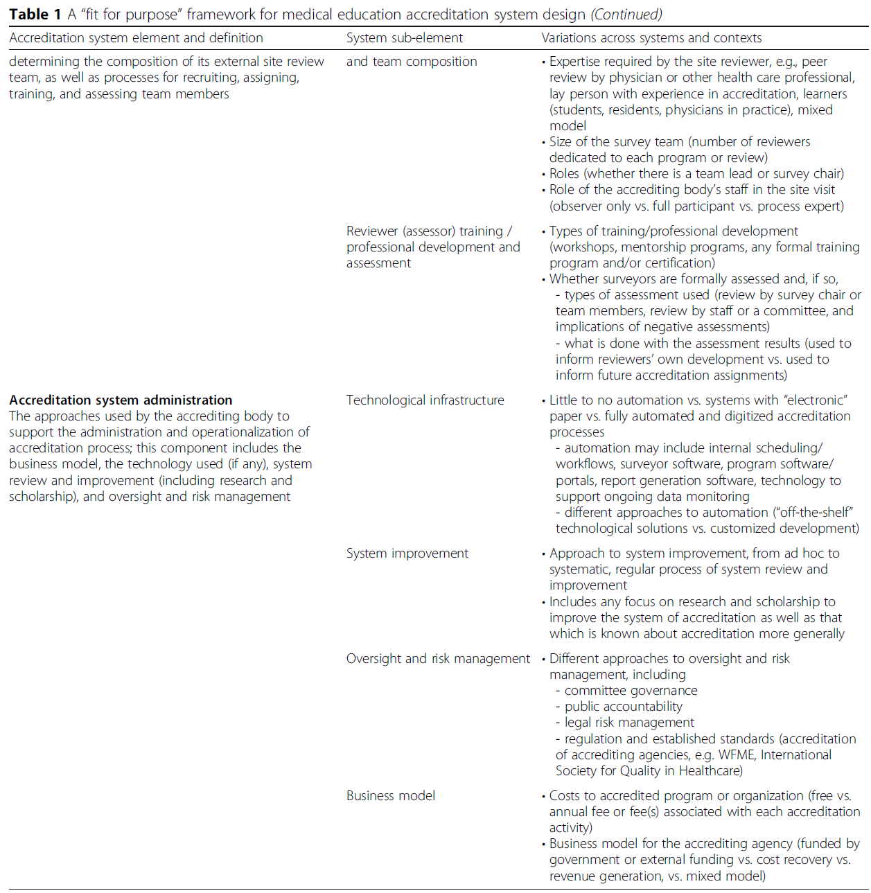 Drawing on their own experience with local accreditation systems, the members of the discussion group also noted that the substantial variation that exists in accreditation systems across jurisdictions, type of education, and stage of training often has little or no identifiable rationale. Although some frameworks for accreditation design do exist, such as the World Federation for Medical Education (WFME) Recognition Criteria for Agencies Accrediting Medical Schools [4, 5] and the quality management framework described by Akdemir and colleagues [6], these frameworks are often specific to one phase of the medical education continuum. This specificity may limit generalizability to other types of health professional education as well as other stages of the medical education continuum. In addition, some frameworks, such as that developed by Akdemir and colleagues [6], focus on the purpose of the accreditation system and other macro-level characteristics, rather than detailed requirements and design characteristics.