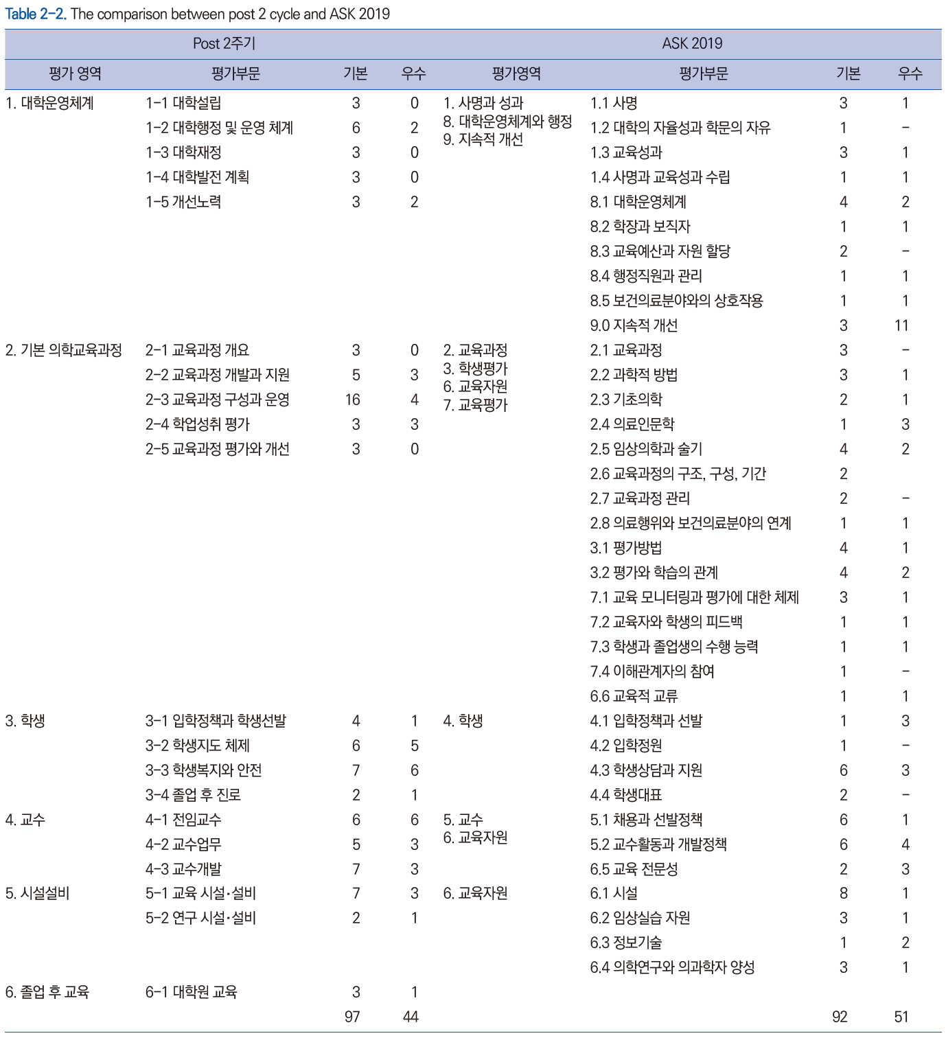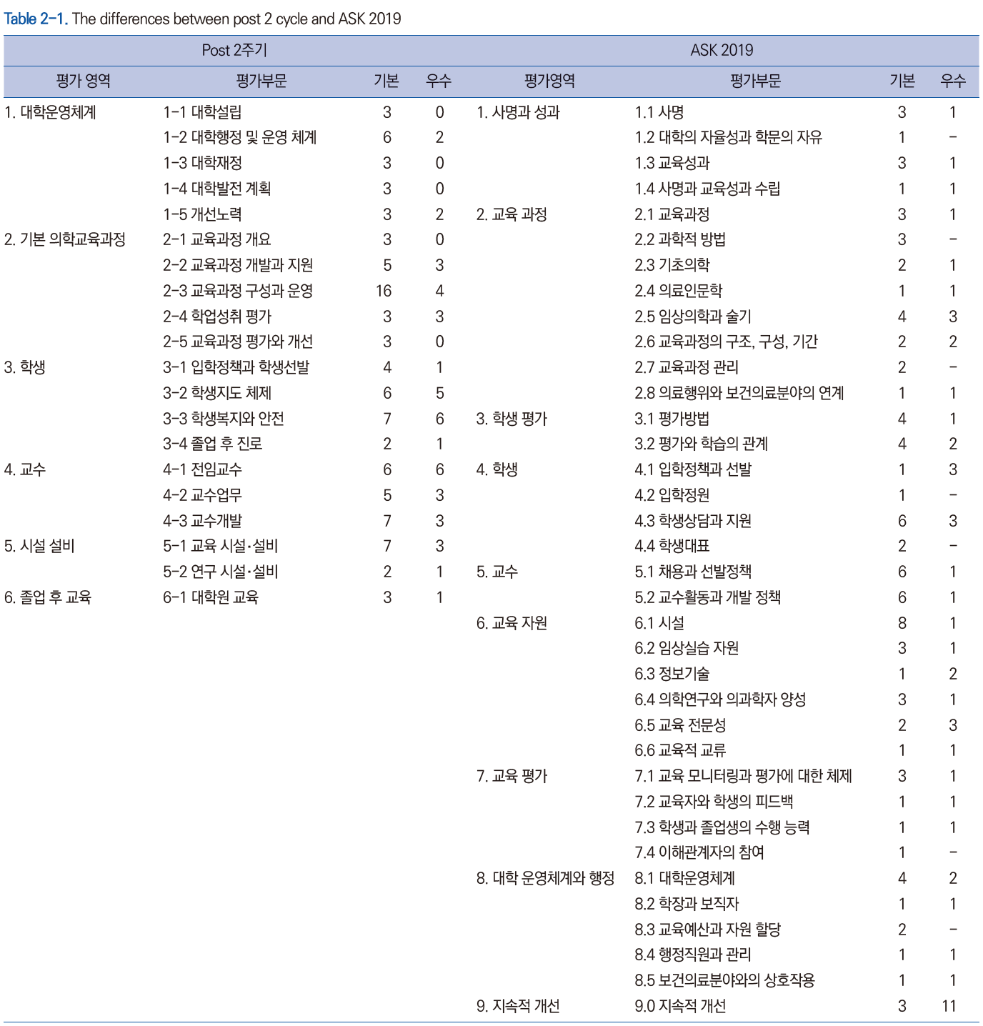 Post 2주기는 평가영역으로 대학운영체계, 기본의학교육과정, 학생, 교수, 시설 설비, 졸업 후 교육의 6개 영역, 20개 평가부문, 기본항목 97개, 우수항목 44개로 구성되었으나 ASK 2019에서는 평가영역으로 사명과 성과, 교육과정, 학생평가, 학생, 교수, 교 육자원, 교육평가, 대학운영체계와 행정, 지속적 개선 등의 9개 영역, 36개 평가부문, 기본항목 92개, 우수항목 51개로 구성되어 전체적인 항목의 수는 크게 변화가 없으며 평가영역과 평가부문이 좀 더 다양화, 구체화되고 독립된 항목으로 구성되어 있다(Table 2-1).