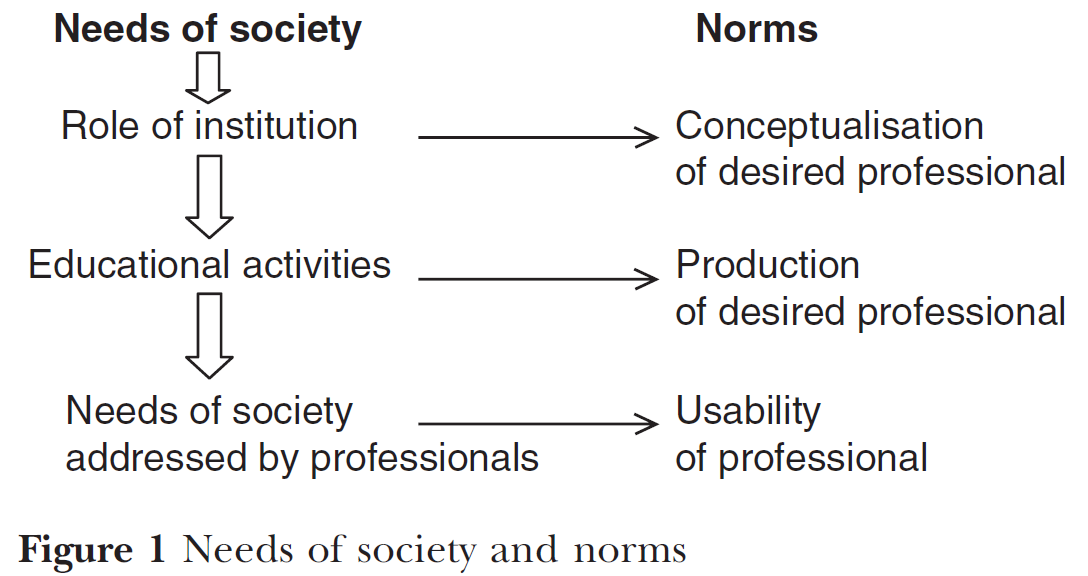 전문직의 '생산자producer'로서, 교육기관은 기관의 산출물output을 활용할 사회 기관들과 일련의 관계를 맺어야 한다. 동시에, 니즈는 끊임없이 진화하기에, 커리큘럼과 목표는 지속적으로 조정되어야 한다는 것을 깨달아야 한다. 이에 필요한 일련의 관계, 정보 수집, 피드백 루프 및 변경의 영향자는 기관이 계획과 조치의 복잡성 원칙을 인식할 것을 요구한다.5-7 따라서 [원인과 결과의 선형 관계]가 아니라, [원하는 output을 정의하고, 실제 output을 측정하는, 명시적이고 적응 가능한 프로세스]를 만드는 것으로 대체되어야 하며, 졸업생이 진입하는 시스템의 요구에 적응해야 한다.