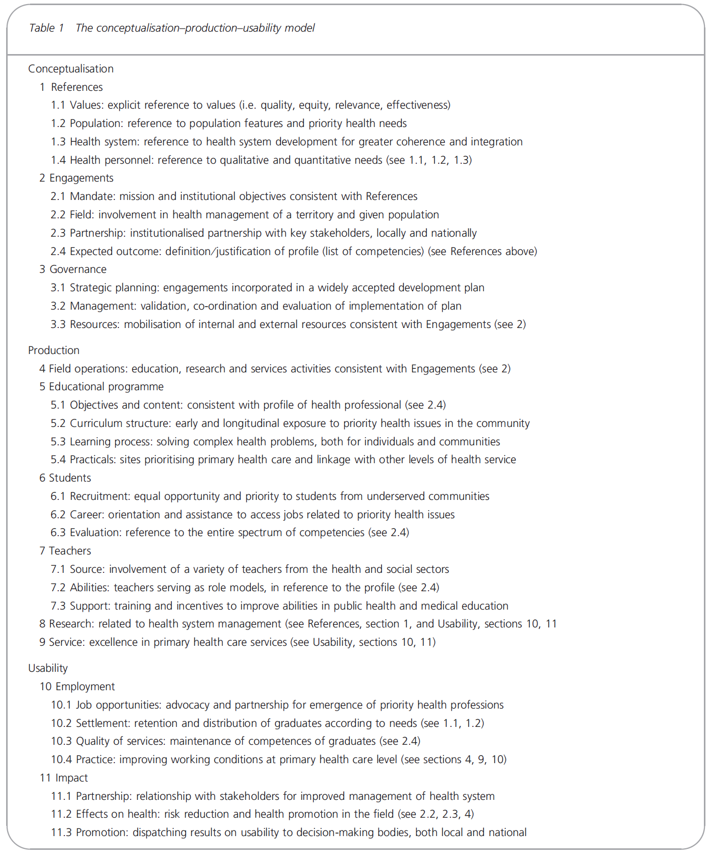 The term ‘usability’ is preferred to the terms ‘utilisation’ or ‘usefulness’. Graduates may indeed be utilised and useful as soon as they are employed in any health care structure, even if they only partially apply the spectrum of competencies in which they have been trained. By contrast, the notion of usability refers to the degree of concordance between their acquired competencies and their opportunities to practise them. Therefore, the domain of usability should reflect processes initiated by the institution to ensure that the profile of a health professional on which the training was based is properly valued in the future working environment.