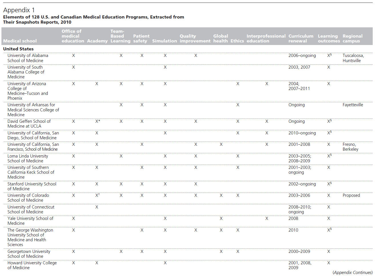 대부분의 보고서에는 교육 프로그램 및/또는 커리큘럼 관리에 대한 다이어그램이 하나 이상 포함되어 있습니다. 2000년 부록에 있었던 것보다 더 많은 도표가 있으며, 거의 모든 경우에, 그들이 묘사한 구조는 2000년 보다 더 복잡하다. 프로그램의 더 많은 통합이 있으며, 일반적으로 위원회의 활동은 "교육부학장"의 단일 사무실에서 조정된다. 캘리포니아 대학교, 샌디에이고, 의과대학, 로마 린다 의과대학은 이러한 접근법을 사용하는 학교 중 하나이다.