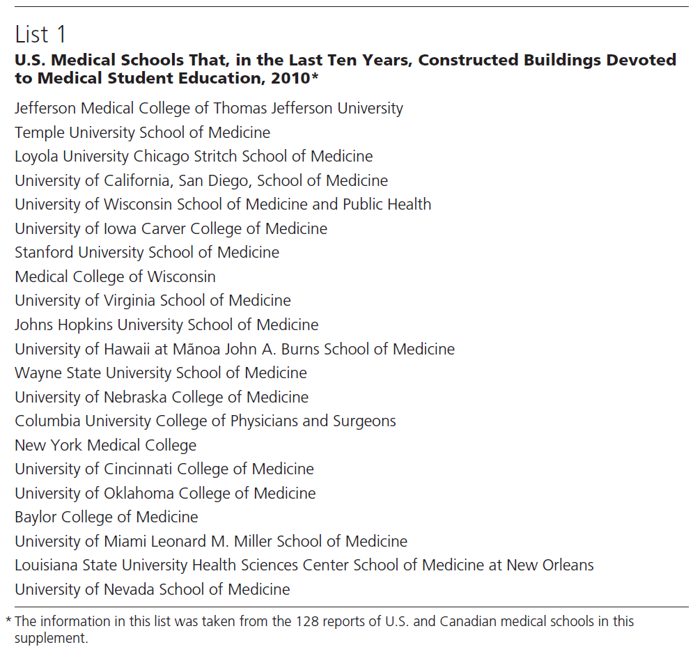 In schools such as Loyola University Stritch School of Medicine, the physical location of the office of medical education is deliberately located in the midst of learning communities. A significant illustration of the attention medical schools are giving to their educational programs is the large number of schools that have funded and constructed buildings devoted to medical student education, as shown in List 1.