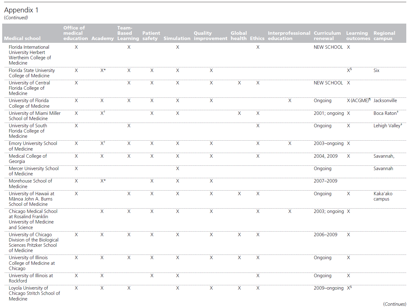 응답 학교 128곳 중 6곳을 제외한 나머지 학교는 모두 지정된 의학교육실office of medical education이 있으며, 지정된 사무소가 없는 학교는 교육프로그램 지원실이 있다. 이 부록에 실린 그녀의 에세이에서, "의학 교육의 변화를 요구하는 10년간의 보고서: 그들은 뭐라고 하는가?",2 Skochelak는 의학 교육을 변화시켜야 할 필요성에 대한 다양한 발표된 보고서에서 공통적으로 다루는 8가지 주제를 파악한다. 진정한 변화가 일어나려면 원로 지도부의 지지가 중요하다는 게 주제 중 하나다. 모든 학교와 제공된 모든 다이어그램에서 교육 프로그램을 지원하는 사무실 또는 행정 단위는 학장에게 자문하고, 학장 및/또는 그 지명자는 교육 프로그램의 관리를 책임진다.